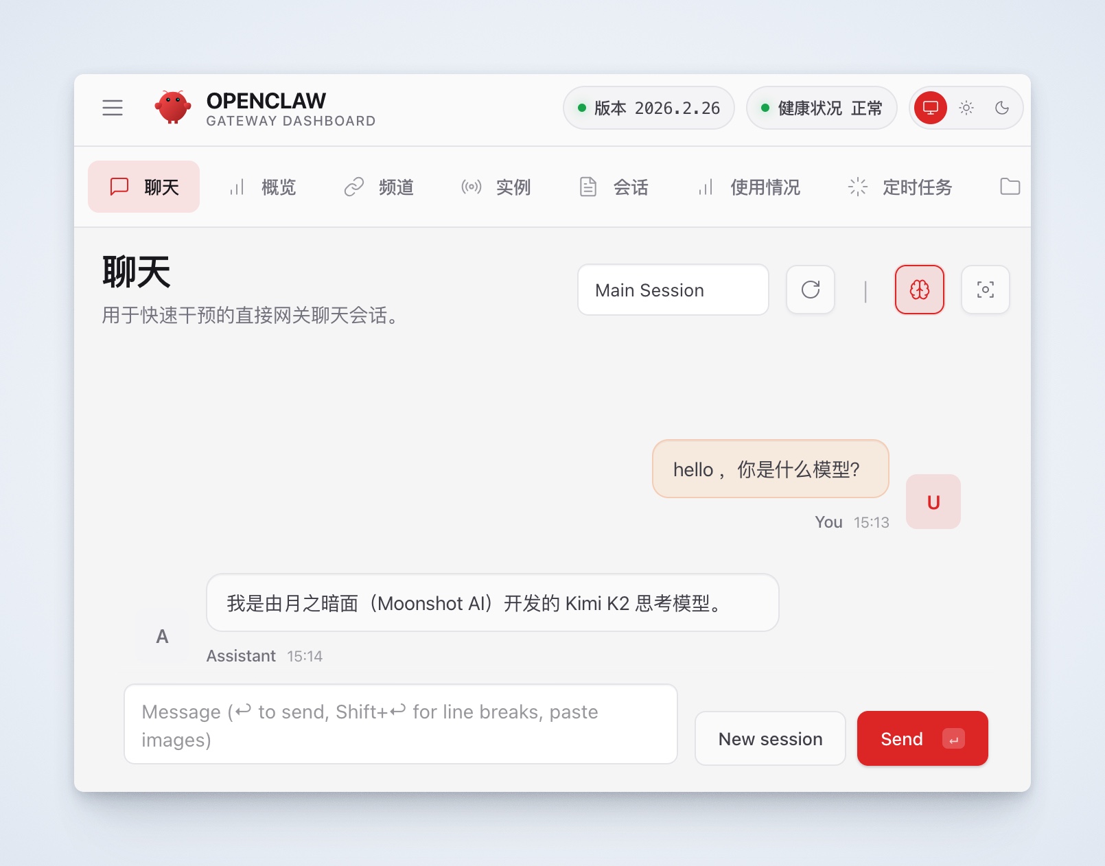 在浏览器打开 http://127.0.0.1:18789/#token=7f65a503bf530797074b8cd1e5084475aafde5da13c61d0c 就可以和 OpenClaw 对话了: